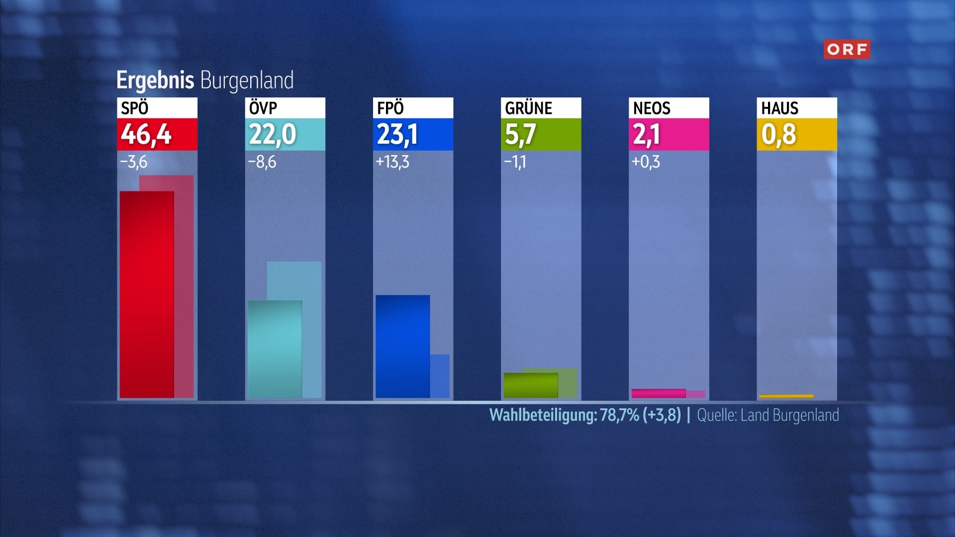 36 sandalyeli parlamentoda SPÖ, 17 sandalye alarak (2 sandalye kayıp) mutlak çoğunluğunu yitirdi. Ancak FPÖ, ÖVP ve Yeşiller’in birlikte hareket etmesi dışında SPÖ’ye karşı bir çoğunluk mümkün görünmüyor. FPÖ 9, ÖVP 8 ve Yeşiller 2 sandalye kazandı. Bu durumda, SPÖ lideri ve eyalet valisi Hans Peter Doskozil’in koalisyon için FPÖ, ÖVP veya Yeşiller arasında bir tercih yapması bekleniyor.