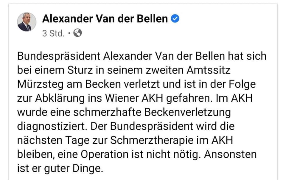 Van der Bellen’in Steiermark eyaletine bağlı Mürzsteg bölgesindeki ikinci resmî konutunda düşüp kalça kemiğini kırdığı açıklandı. Cumhurbaşkanı Alexander Van der Bellen’in sağlık durumuna ilişkin Avusturya Cumhurbaşkanlığı resmi Twitter hesabından yapılan açıklamada, Cumhurbaşkanı Bellen’in tedavi için başkent Viyana’daki Viyana AKH hastanesine kaldırıldığı, leğen kemiğinin zedelendiği ve sağlık sorunun olmadığı ifade bildirildi.