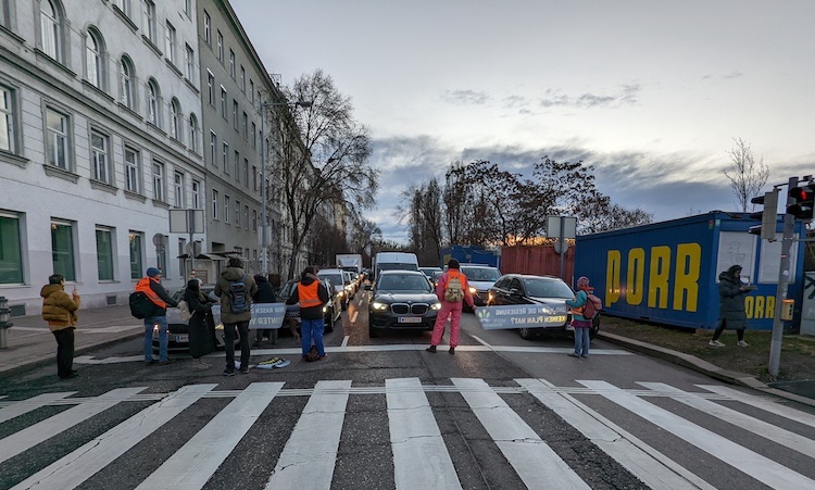 12 Ocak 2023 Perşembe sabahı saat 8’den kısa bir süre önce Viyana-Leopoldstadt’taki Schüttelstrasse’de iki caddede yolu kapattılar. Sözcüleri Florian Wagner’e göre plan, Ostautobahn’daki (A4) trafiği felç etmek ve ardından oradaki yola devam etmekti. Ancak bu girişim polis tarafından engellendi. Yetkililer eylemcileri geniş bir polis varlığı ile olay yerinde bekliyordu.