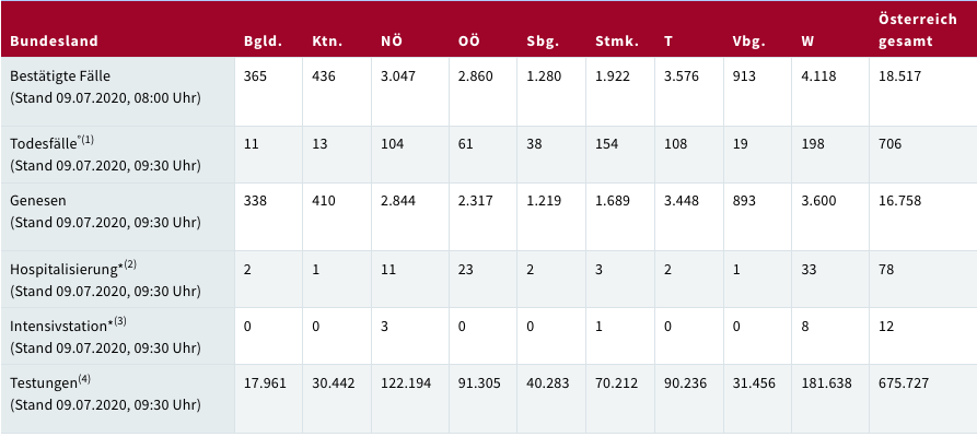 9 temmuz 2020 perşembe günü saat 09:30 itibariyle ülkede total koronavirüs hasta sayısı 18.517 kişi. Avusturya’da toplam 675 bin 727 kişiye test yapıldı.Vaka sayısı 18 bin 517’ye yükseldi. Koronavirüs sebebiyle toplam 681 kişi hayatını kaybetti. İyileşenlerin sayısı 16 bin 758’e yükseldi.