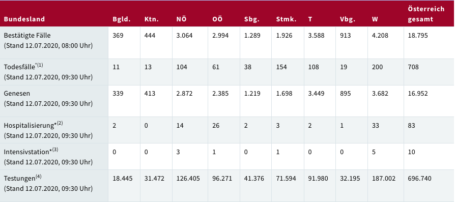 12 temmuz 2020 pazar  günü saat 09:30 itibariyle ülkede total koronavirüs hasta sayısı 1.237 kişi. Avusturya’da toplam 696 bin 740 kişiye test yapıldı.Vaka sayısı 18 bin 795’e yükseldi. Koronavirüs sebebiyle toplam 681 kişi hayatını kaybetti. İyileşenlerin sayısı 16 bin 952’e yükseldi.