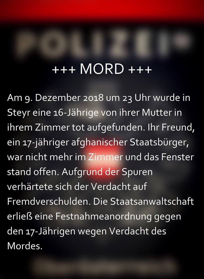 9 Aralık 2018 pazar günü Afgan Asıllı Saber Ahkonzada (17) kız arkadaşının evine ziyarete gelmiş.Pazar akşamı saat 23:00 civarlarında kızının odasına girmek isteyen anne kızının cansız bedeni ile karşılaştı.Erkek arkadaşı artık odada değildi ve pencerede açıktı. Bu Haberler İlginizi Çekebilir Avusturya’da İşsizlere Ek Gelir Sınırı Geliyor: AMS Ödeneğinde 2026’dan İtibaren Yeni Dönem Avusturya hükümeti, işsizlik […]