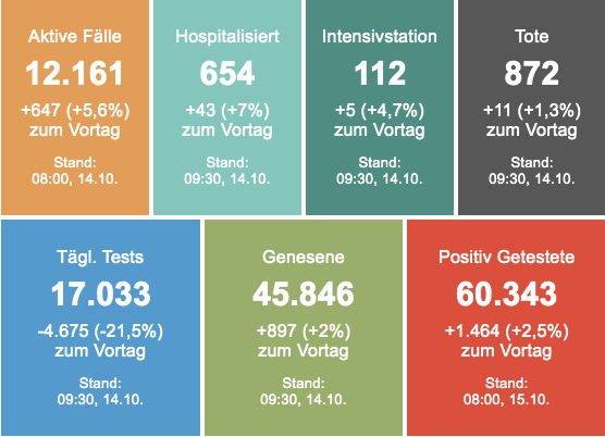 Avusturya’da yeni korona enfeksiyonlarındaki negatif artış eğilimi Perşembe günü de devam ediyor. Çarşamba (1335) günkü rekor artışın ardından, kriz ekibi (Perşembe, saat 9.20 itibariyle) 24 saat içinde 1552 yeni enfeksiyon vakalarında tüm zamanların en yüksek seviyesini bildirdi.