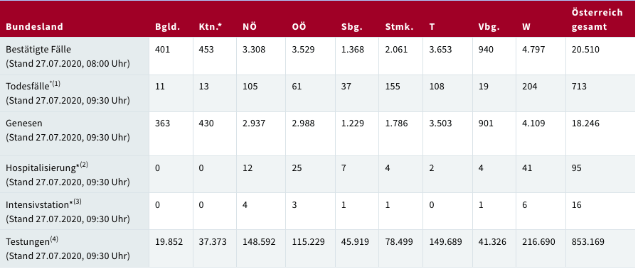 27 temmuz 2020 pazartesi günü Avusturya içişleri bakanlığın verilerine göre, toplam 853 bin 169 kişiye koronavirüs testi yapıldı,20 bin 510 kişinin test sonucu pozitif sonuçlandı.24 saat içinde 5 bin 271 kişiye test yapıldı, yapılan testlerde 96 kişide koronavirüs testi pozitif olarak açıklandı. Son 24 saat içinde sağlığına kavuşan hasta sayısı 37 kişi olarak belirtildi.