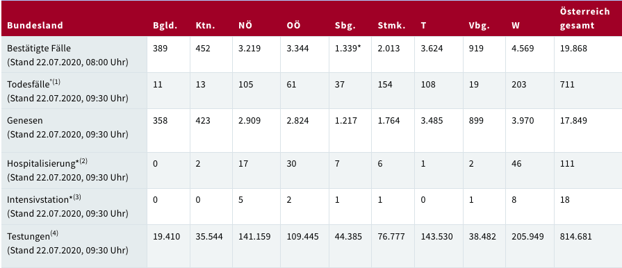 UTKAN HABER (Viyana) – Ülkede koronavirüs vaka sayısı 19 bin 549 kişi, iyileşenlerin sayısı 17 bin 849 kişi,hayatını kaybedenlerin sayısı 686 olarak açıklandı. Avusturya’da 22 temmuz 2020 tarihinde koronavirüs sebebiyle bir kişi hayatını kaybetti.
