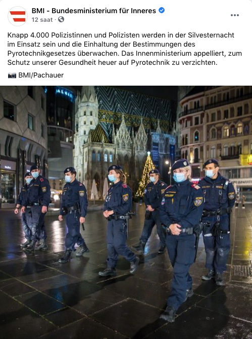 UTKAN HABER (Viyana) – Yılbaşı gecesi yaklaşık 4.000 polis memuru görev yapacak ve Piroteknik Yasası hükümlerine uyumu izleyecek. İçişleri Bakanlığı, sağlığımızı korumak için bu yıl piroteknik uygulamadan uzak durma çağrısında bulunuyor.