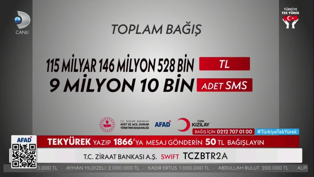 Şimdiye kadar toplanılan bağış miktarı nakdi olarak 115 milyar 146 milyon 528 bin lira, SMS adedi 9 milyon 10 bin oldu.