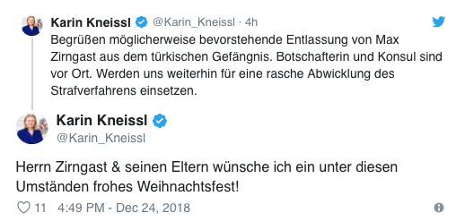 Avusturya Dışişleri Bakanı Karin Kneissl da Zirngast’ın serbest bırakılmasından hemen önce Twitter üzerinden bir mesaj paylaştı.