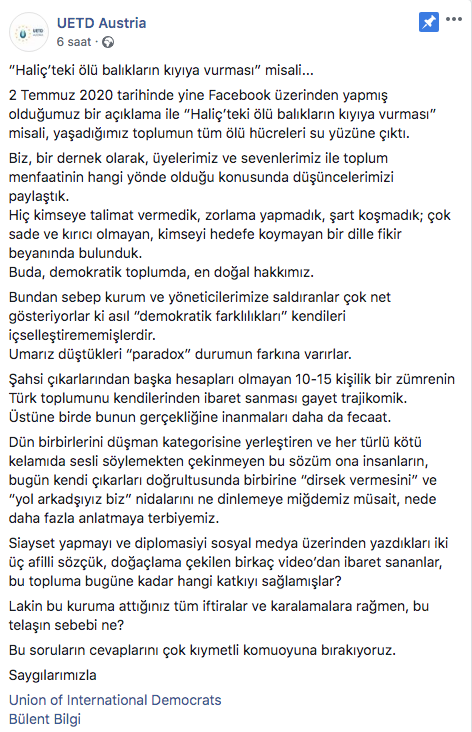 Avusturya Uluslararası Demokratlar Birliği (UID),geçtiğimiz günlerde facebook hesabından yapmış olduğu paylaşımdan sonra gelen eleştirelere cevap verdi.
