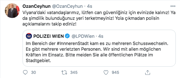 Viyana Büyükelçisi Ozan Ceyhun, TRT Haber canlı yayınında, vatandaşlarını evlerinden çıkmamaları konusunda uyardı: “Kanlı ve zor bir gece geçiriyoruz. Teröristler uzun namlulu silahlarla sokaklarda geziyor. Lütfen tehlike geçene kadar bulundukları yerlerden ayrılmasınlar.**” Ayrıca, sosyal medya üzerinden de “Viyana’daki vatandaşlarımıza, lütfen can güvenliğiniz için evinizde kalınız” çağrısında bulundu.